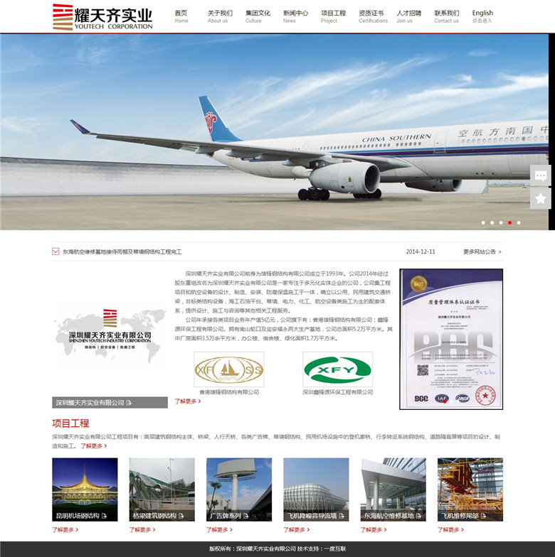 深圳耀天齊實(shí)業(yè)有限公司前身為深圳市雄鋒鋼結(jié)構(gòu)有限公司成立于1993年。公司2014年經(jīng)過(guò)股東重組改名為深圳耀天齊實(shí)業(yè)有限公司是一家專(zhuān)注于多元化實(shí)體企業(yè)的公司,公司集工程項(xiàng)目和航空設(shè)備的設(shè)計(jì)、制造、安裝、防腐保溫施工于一體,確立以公用、民用建筑交通橋梁,非標(biāo)類(lèi)結(jié)構(gòu)設(shè)備、玻璃幕墻鋼結(jié)構(gòu)、民用航空設(shè)備等的設(shè)計(jì)、制造和施工為主的配套體系,提供設(shè)計(jì)、施工與咨詢(xún)等其他相關(guān)工程服務(wù)。